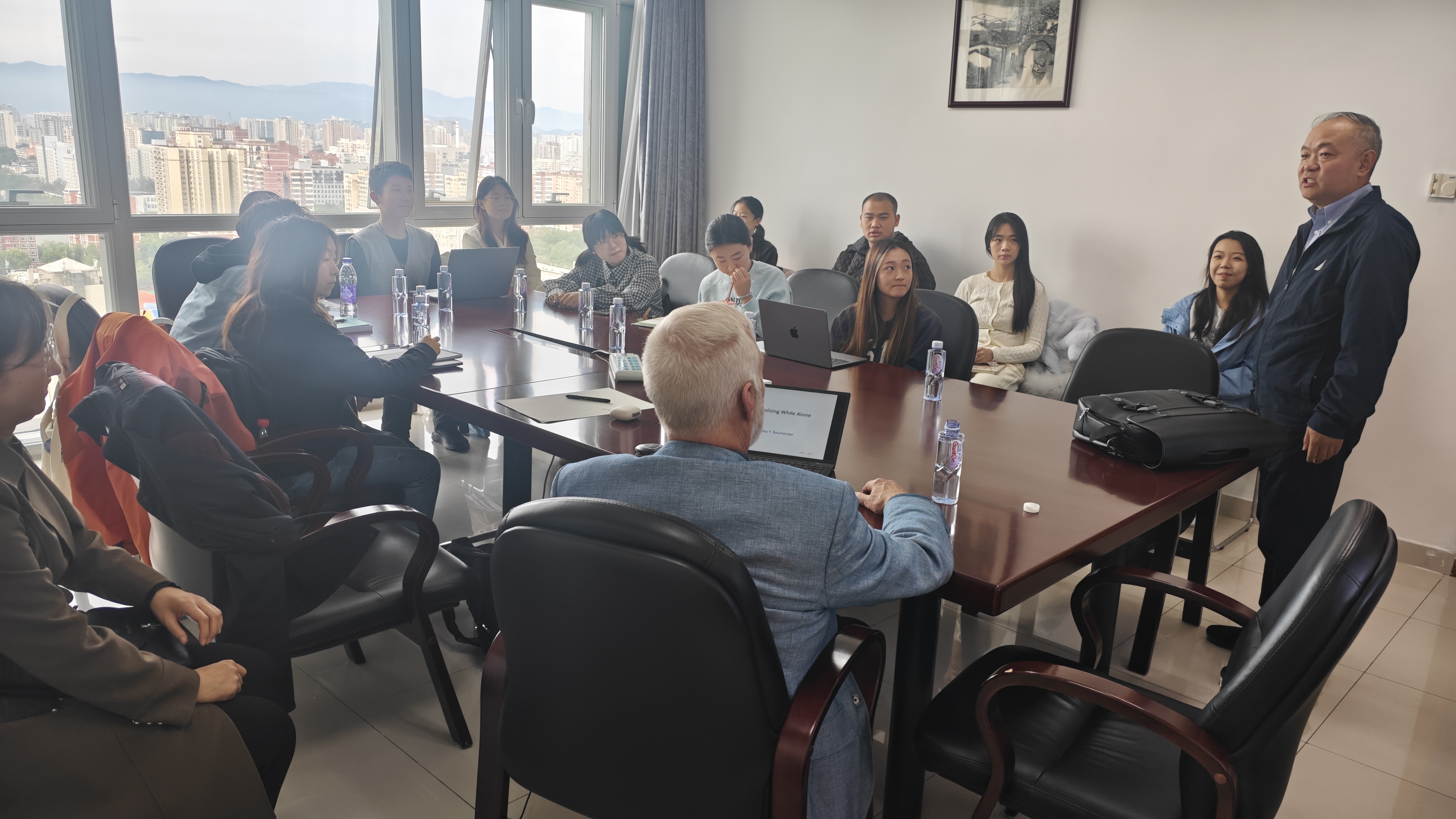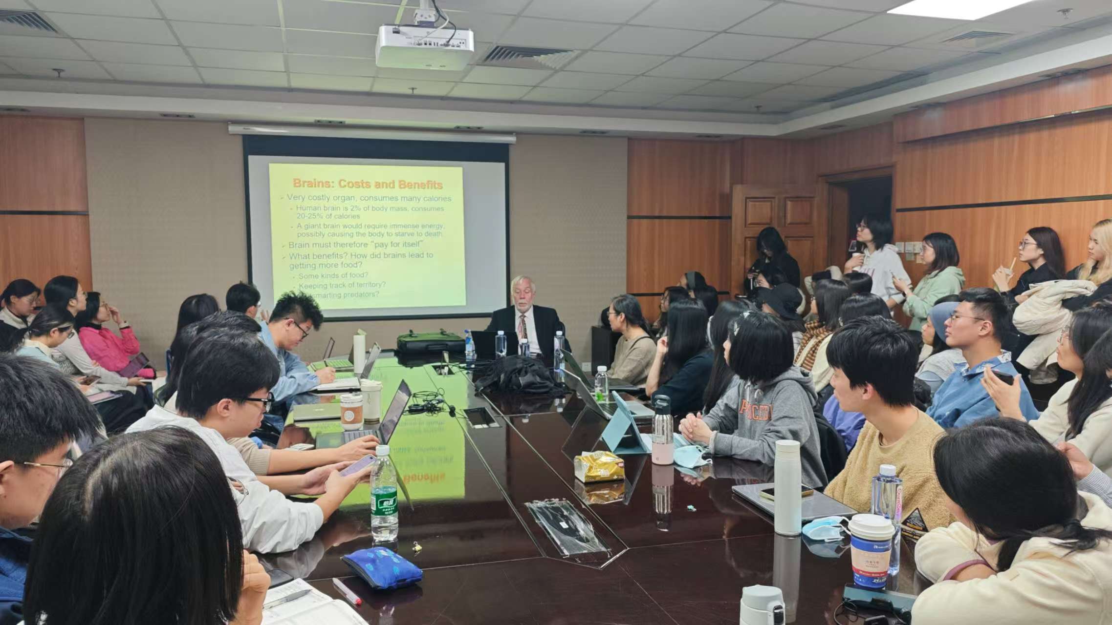 2025年10月22日下午14:00,面向本科生的第三场讲座在后主楼2026开展。本次主题为“人类的本质和文化”。Baumeister教授指出,人类的本质服务于文化。比如,人类最重要的特征,交流和合作极大程度地丰富了文化的内容。文化提升大脑的功能。人类大脑的进化是为了参与文化。人类文化包括学习行为、分享信息、代际传递、团体组织、信念、实践规则和社会规范等。文化是人类独有的特征。它促进言语学习、知识积累、劳动分工和物品交换,提升人类的繁衍和发展。 Baumeister教授也客观分析了文化与天性之间的潜在冲突,以及文化可能带来的负面问题,但最终从生物种群繁衍的角度,肯定了文化的巨大成功。