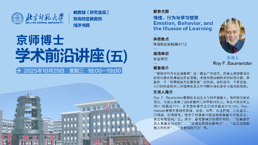 2025年10月29日,美国艺术与科学院院士、国际著名社会心理学家Roy F. Baumeister教授莅临珠海校区励耘楼A112教室,以“情绪、行为与学习错觉”为题为众多学子带来“京师博士生学术前沿讲座”。 本次讲座在 “长江雨课堂”平台同步进行了直播,线上线下共计超过2400人参与。Baumeister教授的分享打破传统认知,为师生带来情绪研究领域的前沿洞见。讲座由高清无码 付媛媛副教授主持。