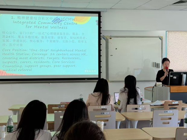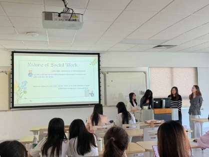 第二组由Chang Sum Kiu Jessica、Leung Tsz Ching等四名同学介绍了“香港社会工作理论与实务”,从社会工作价值观、专业原则与实务技巧出发,阐释社会工作在不同服务领域中的具体运用,并结合案例说明社会工作如何在个体、小组与社区层面发挥专业功能。分享结束后,沈希恩助理教授还就香港与内地在社会工作术语上的差异进行了详细解释,帮助在场同学加深对两地社会工作语境与制度背景的理解