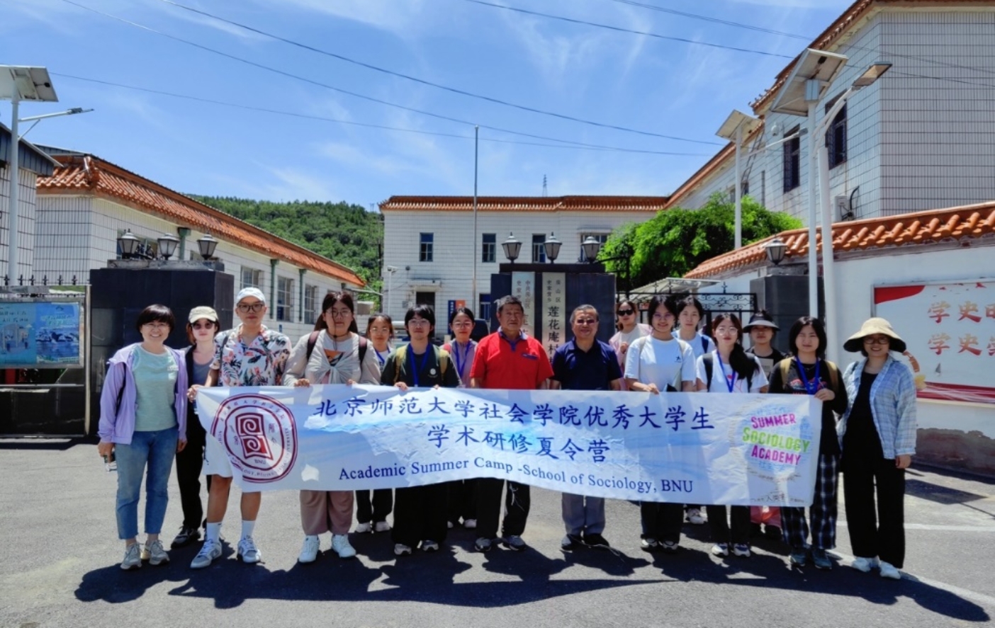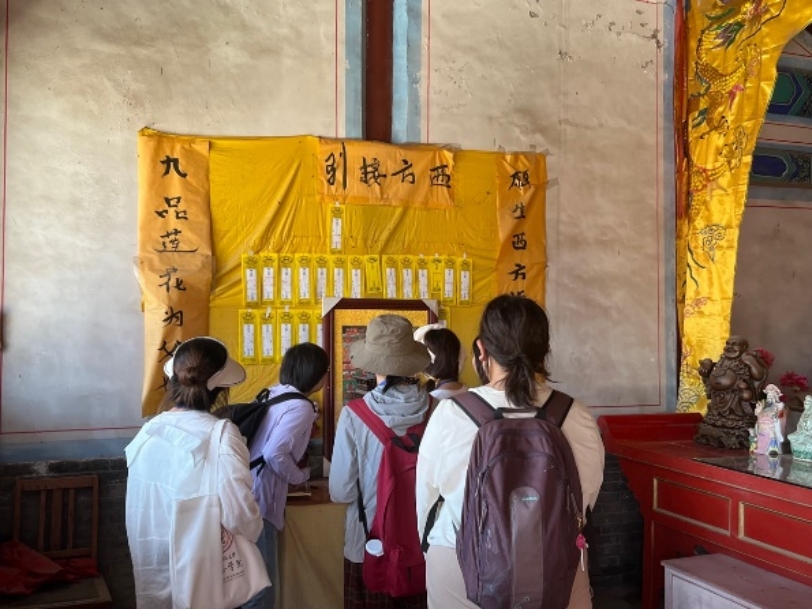 鞠熙、贺少雅老师带队,与营员们身处北京市第三高峰的绿树百花中,老师们向学生们讲解了田野调查方向,普及了庙会和民俗学相关知识,并参观了山顶观音殿、文殊阁等庙宇,通过莲花庵村党支书及支部组织委员了解到窑王庙的祭拜情况等历史沿革。双方气氛热烈的座谈和交流取得丰硕成果,为民俗和非遗专业拓展了新的田野点。